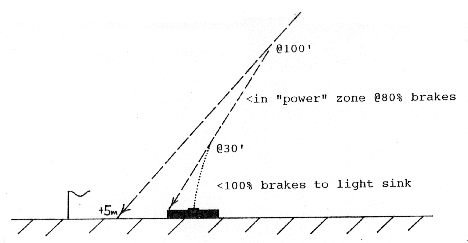 As you approach 100′ you are about 10 seconds from landing The “European” or short final approach intersects your glidepath at this point, completing a curving downwind approach that aims to pass through the same “window in the sky” you are now flying through. It’s time to aim a little closer to the pad, which you/ do by increasing brakes to 80%, hands level with your sternum, forearms about 30° above a horizontal position (see figure 1).’